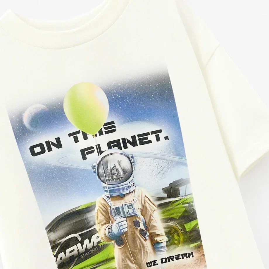 Белый фон и яркий принт с астронавтом делают эту вещь акцентом в образе. Настоящий street casual для девочек, которые любят мечтать и идти вперёд. Лёгкий и удобный крой обеспечивает комфорт в течение всего дня, а универсальный дизайн легко комбинируется с брюками и джемперами из капсулы.