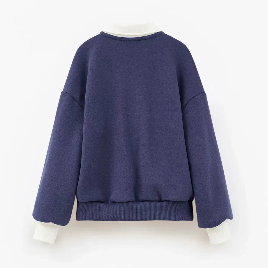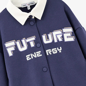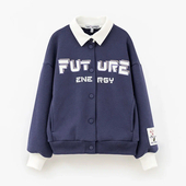Тёмно-синий жакет с контрастными манжетами и воротником — про характер, стиль и уверенность. Удобный крой, плотный футер и выразительная надпись делают модель универсальной: подойдёт и для повседневных образов, и для более собранных выходов.