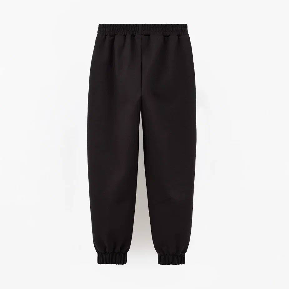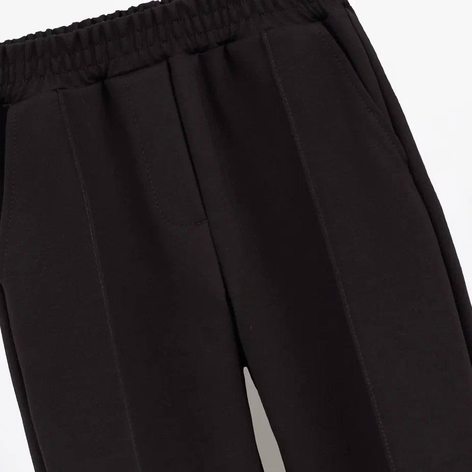 Чёрные брюки с аккуратными декоративными стрелками, карманами и манжетами по низу. Уверенная посадка и мягкое трикотажное полотно дарят комфорт на весь день, а строгие линии помогают выглядеть аккуратно и собранно — идеально для сада, прогулок и семейных выходов.