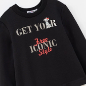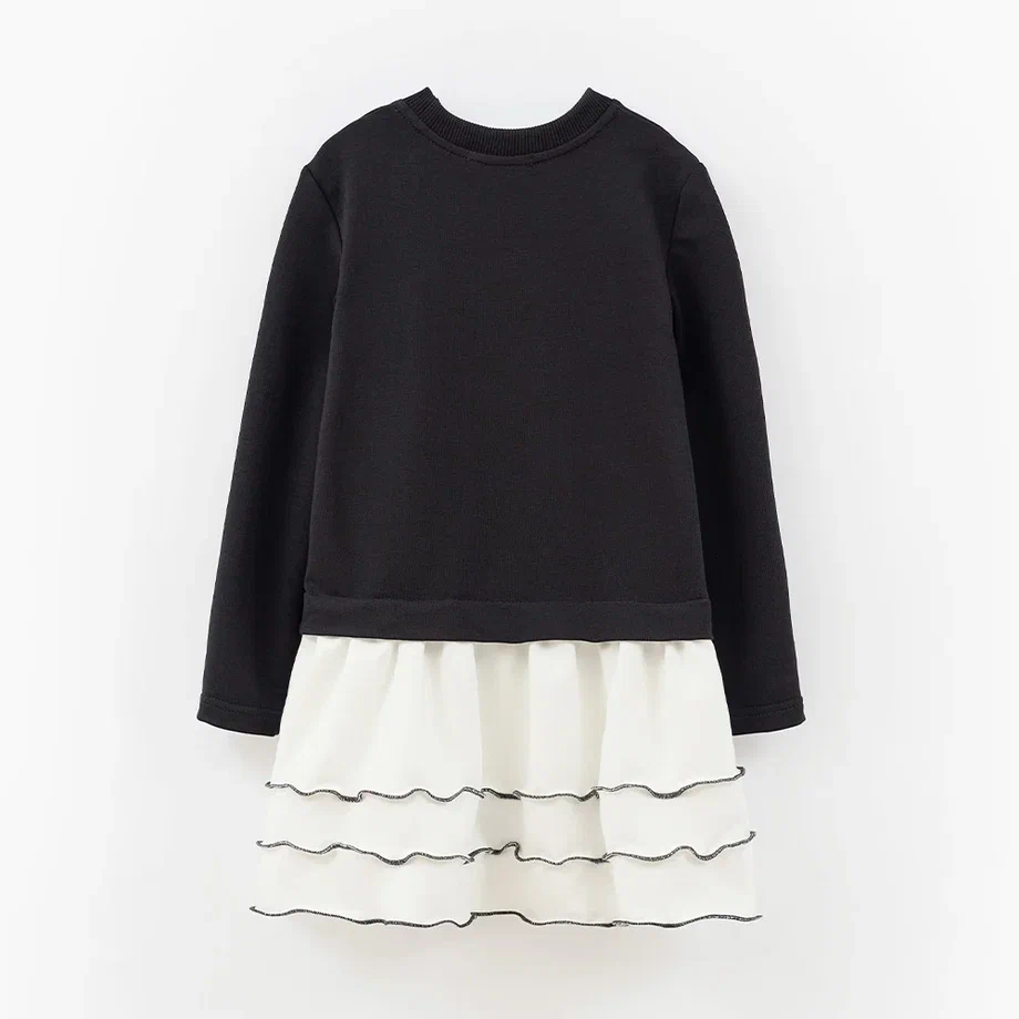 Чёрное платье с мягким футером и аккуратными воланами — комфортное и выразительное одновременно. Лёгкий игривый акцент в надписи добавляет характер, а удобный крой позволяет носить платье каждый день: в сад, на прогулки и на праздники.