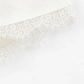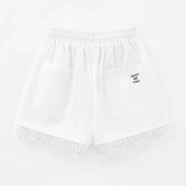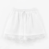 Прямой широкий силуэт дополнен жатым эффектом ткани. Кружево по низу добавляет деликатности. Пояс с эластичной лентой и функциональным шнурком регулирует посадку, накладные карманы делают модель удобной для повседневной носки.