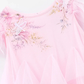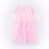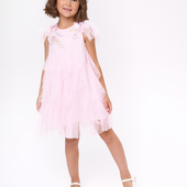 Летящий А‑образный силуэт из лёгкой ткани создаёт воздушность. Плечики с декоративными перьями, вышитые элементы с пайетками и пуговичка на спинке добавляют сияния и делают образ завершённым.