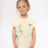 Мягкий хлопок обеспечивает комфорт в течение дня. Прямой крой и приспущенная линия плеча создают расслабленную посадку. Рукав-волан со сборкой добавляет воздушности, а цифровой принт со стразами делает модель ярче.