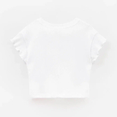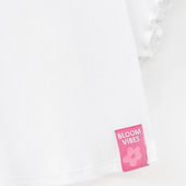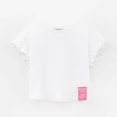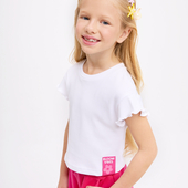 Прямой крой с приспущенной линией плеча создаёт комфортный силуэт. Рукав-волан добавляет нежности. Термоплёнка и нашивка из киперной тесьмы усиливают графичный характер модели.