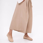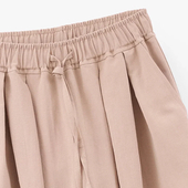 Светло-коричневый оттенок и свободный силуэт формируют расслабленный образ. Бантовые складки добавляют аккуратный объём. Длина легко сочетается с разной обувью, пояс регулируется мягким шнурком для комфортной посадки.