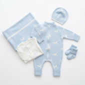 Комплект «Холли» — это тёплый, уютный и очень красивый комплект для новорождённого. Голубой цвет выглядит нежно и аккуратно, подойдёт для выписки, фотосессии и прогулок. В комплект входит вязаный плед, комбинезон, шапочка, пинетки и слип — всё, чтобы собрать полноценный комплект для малыша. Все изделия хорошо сочетаются между собой и подходят для первых месяцев жизни ребёнка.