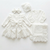 Комплект на выписку «Ненси» — это нежный и нарядный комплект для первого важного события. Молочный цвет смотрится очень аккуратно, воздушно и красиво на фотографиях. В комплект входит платье, плед, чепчик и бант на резинке — всё выполнено в едином стиле, благодаря чему получается готовый образ для выписки или фотосессии. Ткань мягкая и приятная к телу ребёнка, подходит для новорождённых и не вызывает дискомфорта.