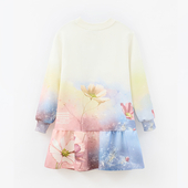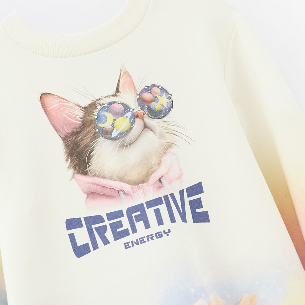 Нежное платье с мягким футером и волшебным градиентом в космических оттенках. Лёгкий набивной принт с цветами и забавным котом создаёт атмосферу игры и фантазии. Подойдёт для прогулок, праздников и ярких моментов, когда хочется выделиться.