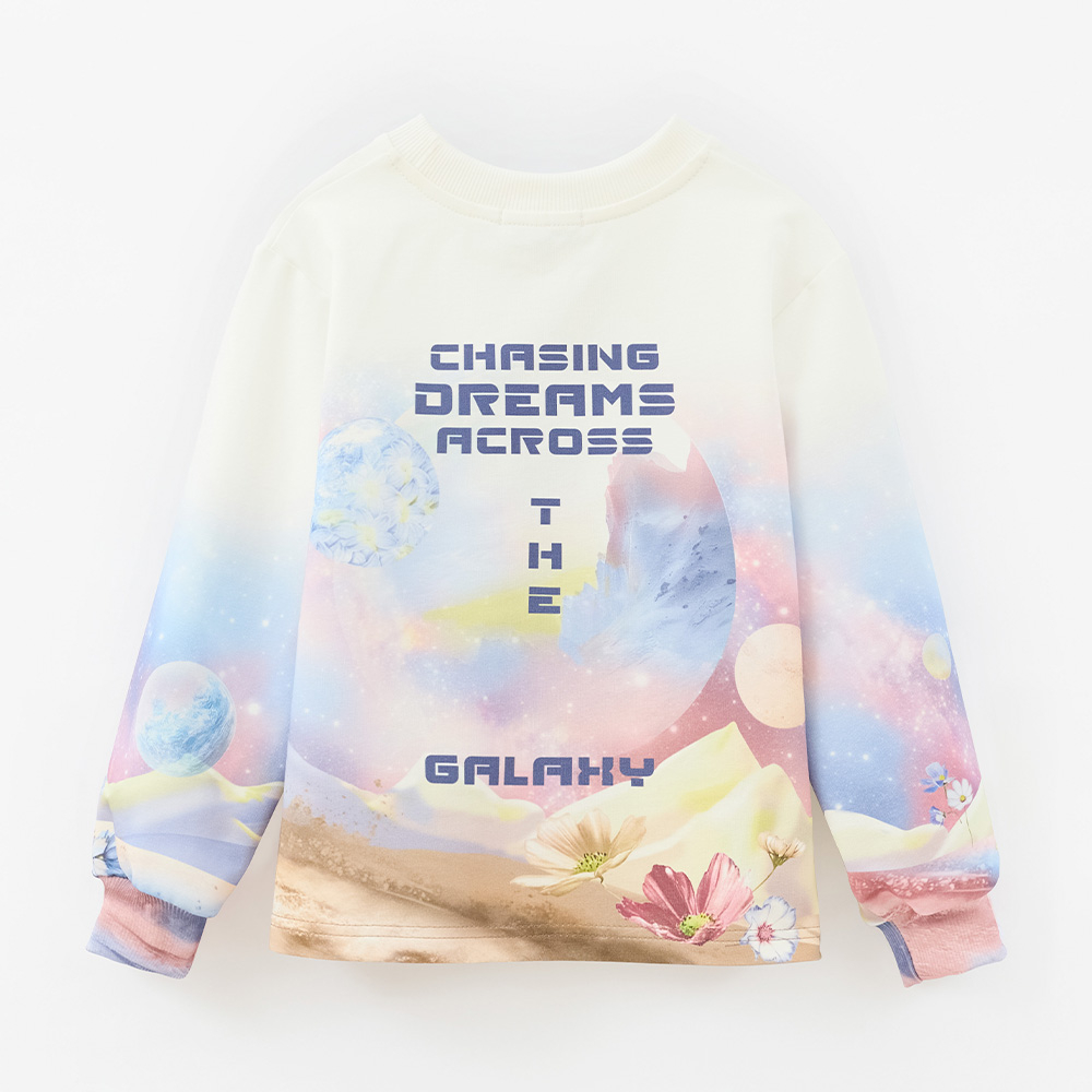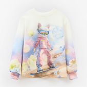 Яркий и игривый джемпер с космокотом, покоряющим волны далёкой галактики. Свободный крой и мягкий футер делают его удобным для активных девочек, а необычный принт — настоящей «фишкой» образа. Легко сочетается с брюками «Космическая Орбита» и футболкой «Космическая Компания».