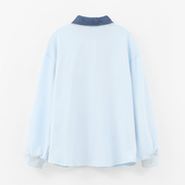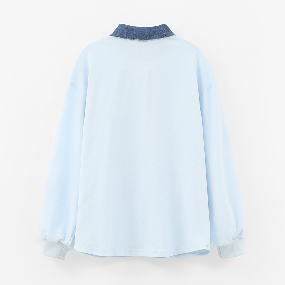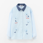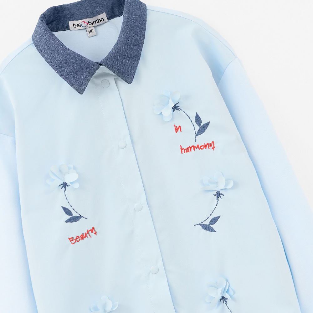 Нежная голубая рубашка с контрастным тёмным воротником создаёт образ лёгкости и городской утончённости. Объёмные цветочные элементы на планке добавляют выразительный акцент, делая образ праздничным, но при этом повседневно удобным. Идеально подходит для прогулок, школы и стильных городских сетов.
