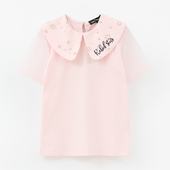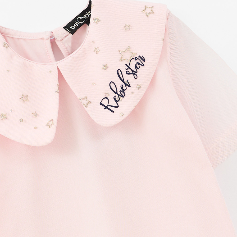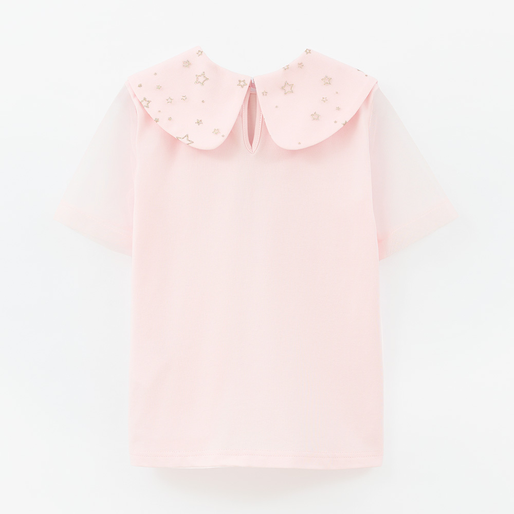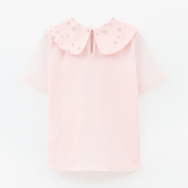 Светло-розовая футболка с волшебным воротничком и воздушными рукавами из сеточки создаёт сказочный образ. Свободный крой и мягкая ткань обеспечивают комфорт. Идеально сочетается с другими элементами капсулы для праздничных и фотогеничных комплектов.