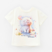Милейший котёнок, фантастические цветы и крошечные планеты создают волшебный образ, который влюбляет с первого взгляда. Футболка легко собирает нежный повседневный комплект и добавляет игривый акцент в образ малышки — мягко, уютно и очень по-детски.
